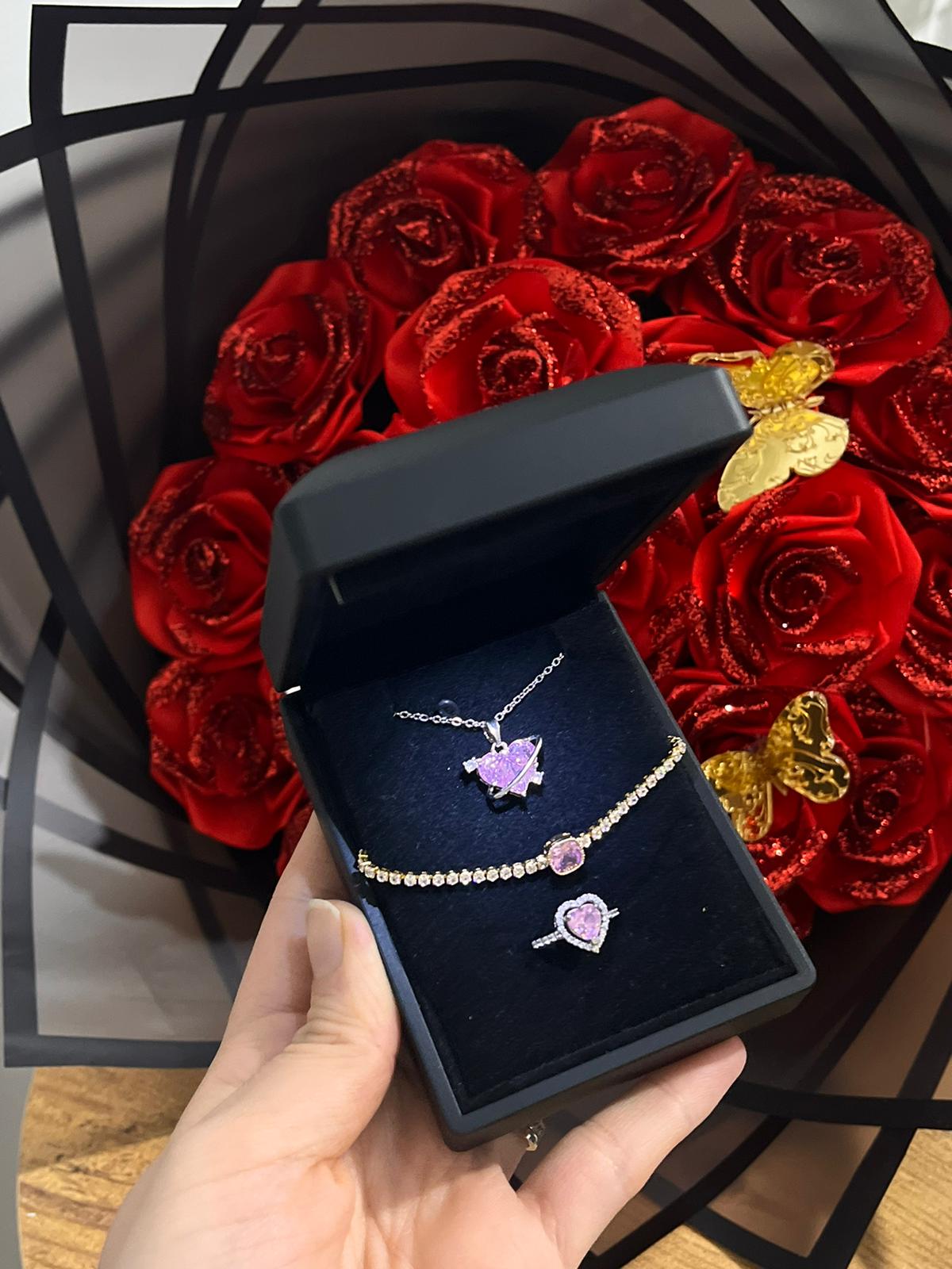 Işıklı kutuda altın kaplama kalp kolye+bileklik + ciddi ilişki yüzüğü