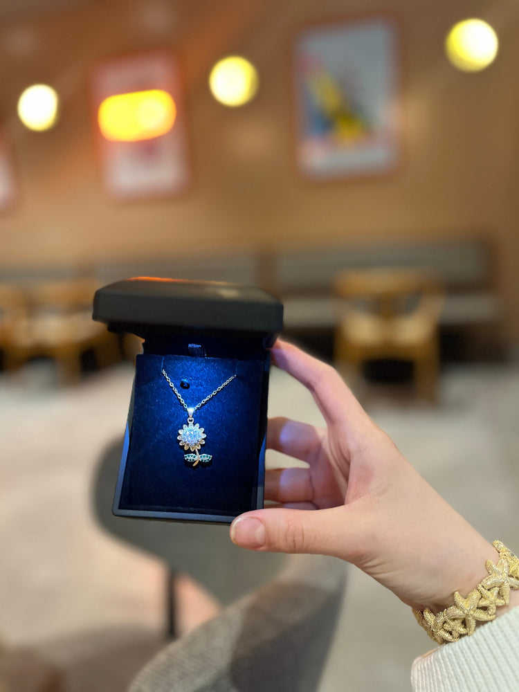 Işıklı kutuda altın kaplama papatya kolye